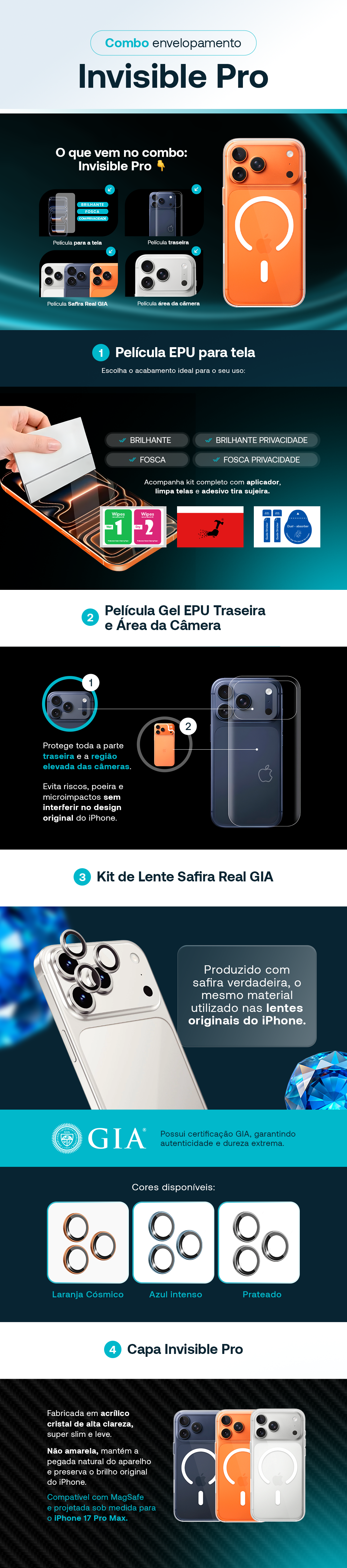 Inclui proteção para tela, traseira e área da câmera, além do Kit de Lente Safira Real GIA e da Capa Invisible Pro, totalmente transparente, super slim e compatível com MagSafe.
